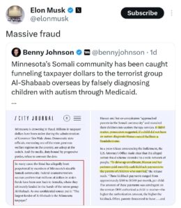 Adding to the controversy, billionaire Elon Musk shared tweets from Benny Johnson, accusing the Somali community of widespread fraud. Musk retweeted and endorsed these claims, further spreading the narrative.